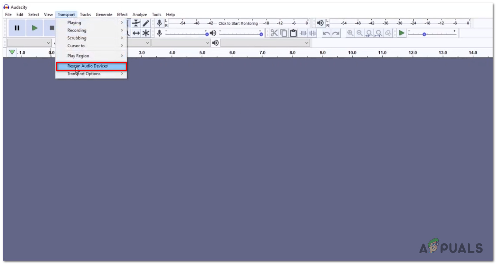 - Open Audacity and go to the Transport menu at the top. Select Rescan Audio Devices and let the scan complete.