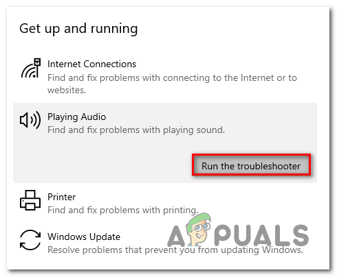 Accessing the Troubleshooting tab on Windows 10 - In the Troubleshooting window, scroll to Get up and running and select Playing Audio. Click Run the troubleshooter.
