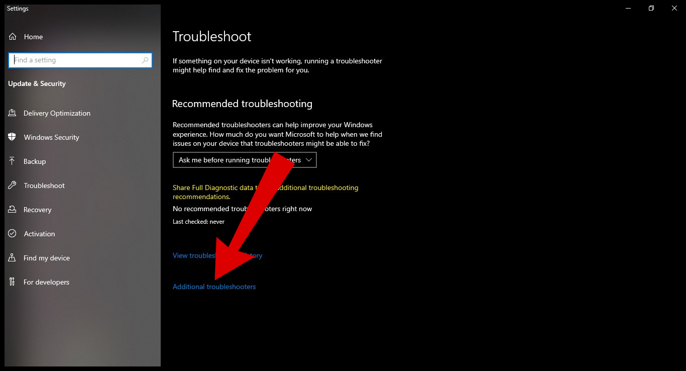Search Troubleshooting Settings - Click on Additional troubleshooter to see all options.