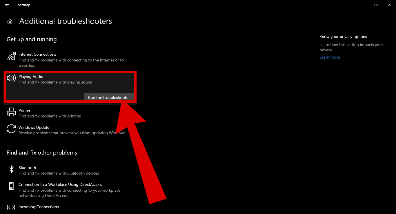 Click on Additional settings - Under the Get up and running section, click Playing Audio and select Run the troubleshooter.