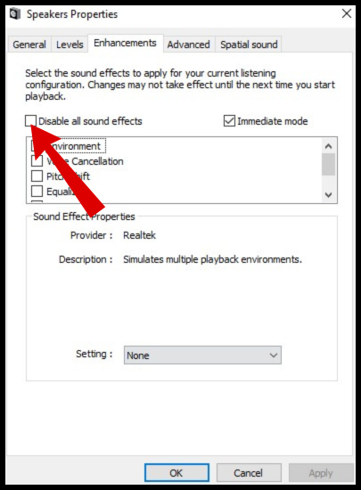 Click on Additional Device properties - When the menu opens, go to the Enhancements tab. Then select Disable all sound effects.