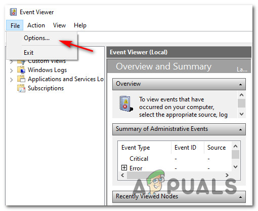 Opening the Event Viewer via Run dialog box - Once you’re inside Event Viewer, use the ribbon at the top to click on FIle. Then, from the context menu that just appeared, click on Options.