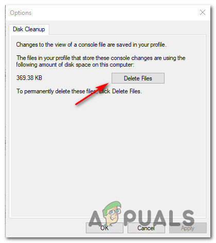 Accessing the Options menu of Event Viewer - Inside the Options menu, click on Delete Files (under Disk Cleanup) and confirm when asked at the prompt by clicking Yes.