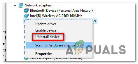 - Return to the Network adapters drop-down menu inside Device Manager, right-click on the Wireless Network Adapter, and click on Uninstall Device from the context menu that just appeared.