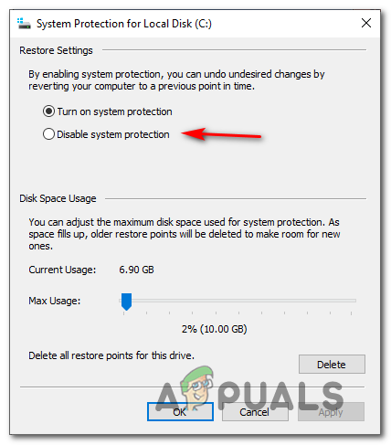 Accessing the System Protection settings - Under Restore Settings, select Disable system protection. Click Apply to save your changes.