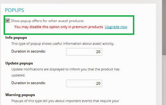 Unchecking the “Show Popups for other avast products” option - This will stop ad popups. You can also disable other popups from this window if you wish.