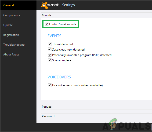 Unchecking the “Enable Avast Sounds” option - Avast will no longer play sounds when pop-up notifications appear.