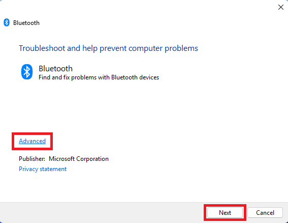 - When the Bluetooth troubleshooter window opens, click Advanced, check the option Apply repairs automatically, and click Next.