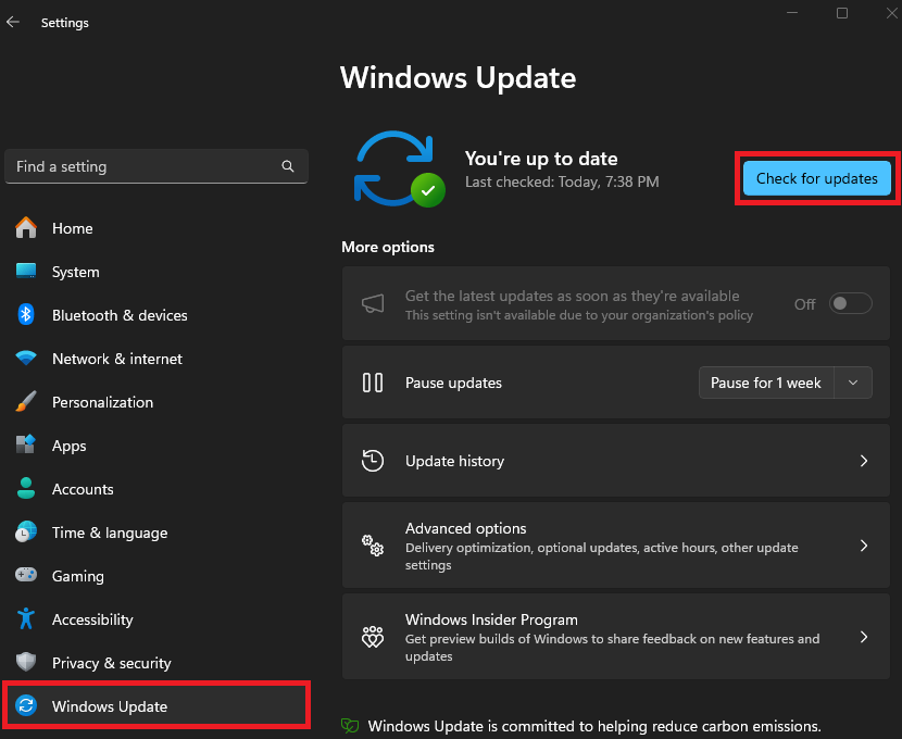 - Click Check for Updates so that Windows can find and install the latest updates automatically.