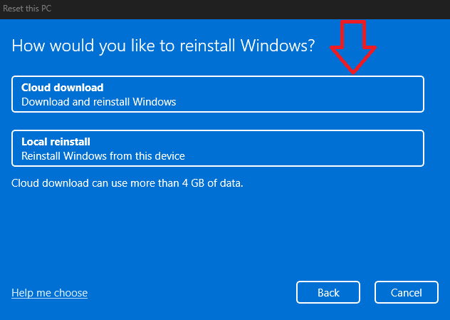- When prompted, select Cloud Download. This will allow Windows to download and replace any damaged system files.