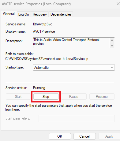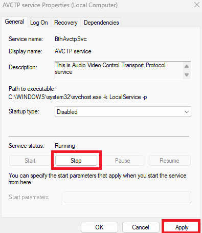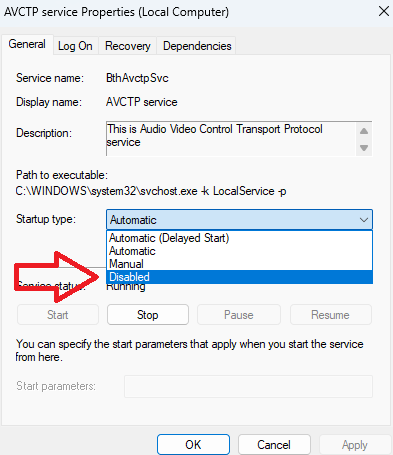 - If you’re still facing the issue, go back to Services Management Console > AVCTP service, then set Startup type to Disabled.