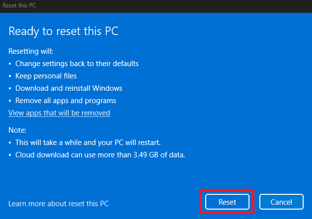 - Finally, choose Reset to start the process. Windows will show you one last summary of your choices before beginning.