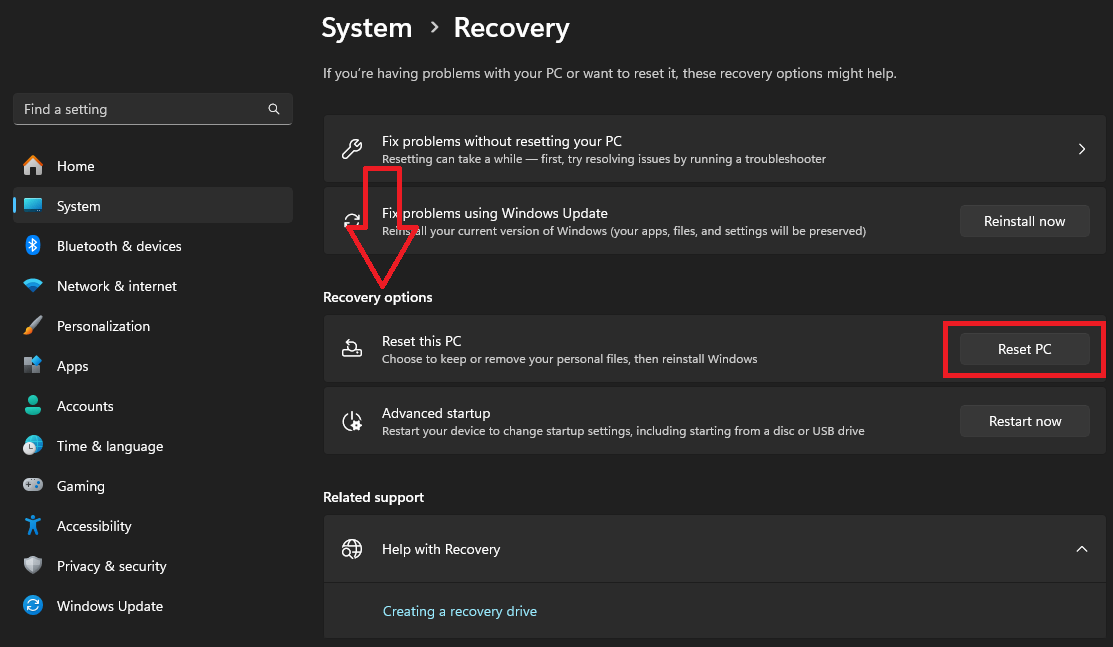 - Click the Reset this PC button under Recovery options.