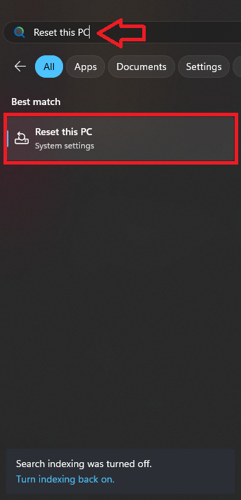 - Open the Start menu, search for Reset this PC, and click on it.
