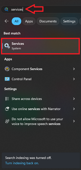 - Open the Start menu, search for Services, and click to open it.