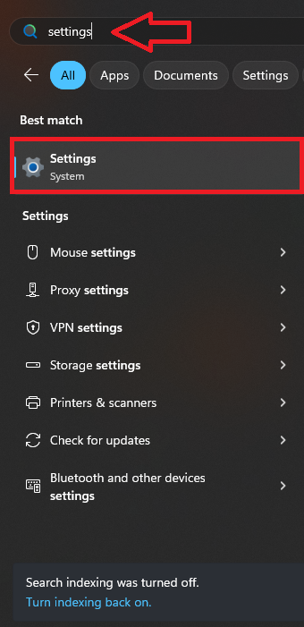 - Click the Start button, search for Settings, and open it.