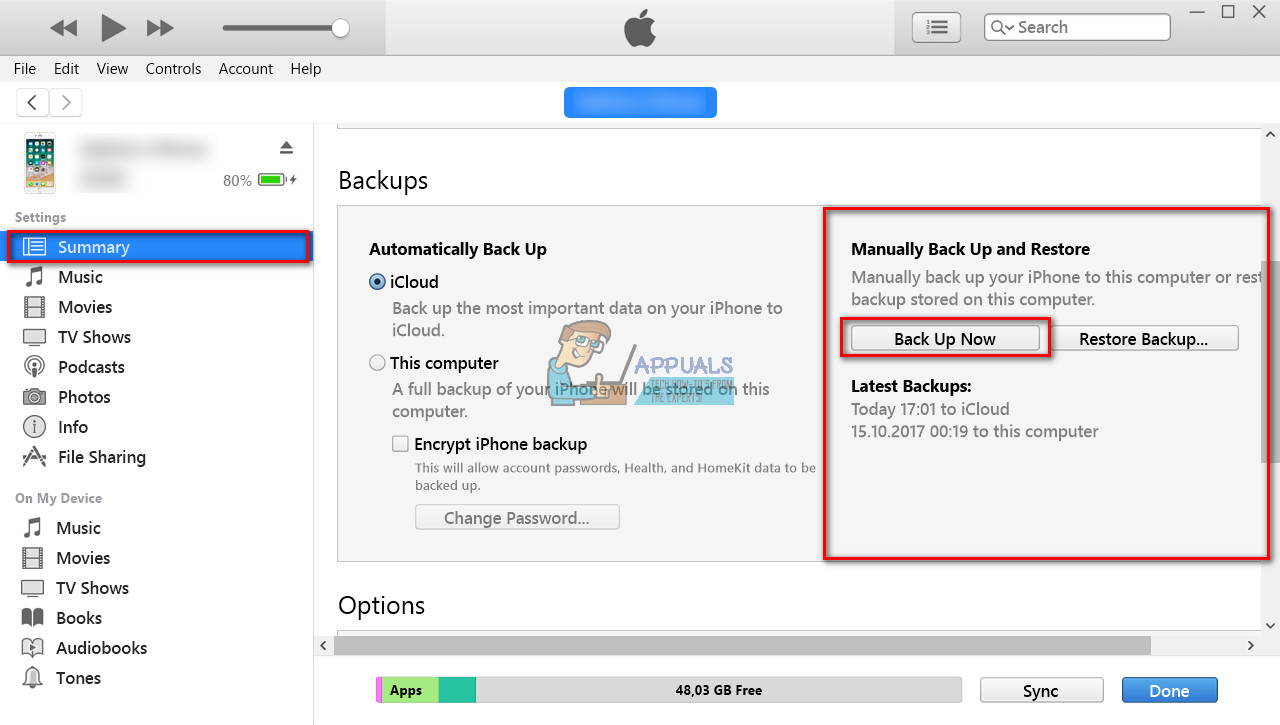In the Manually Back Up and Restore section, click “Back Up Now” and wait for the backup process to finish.