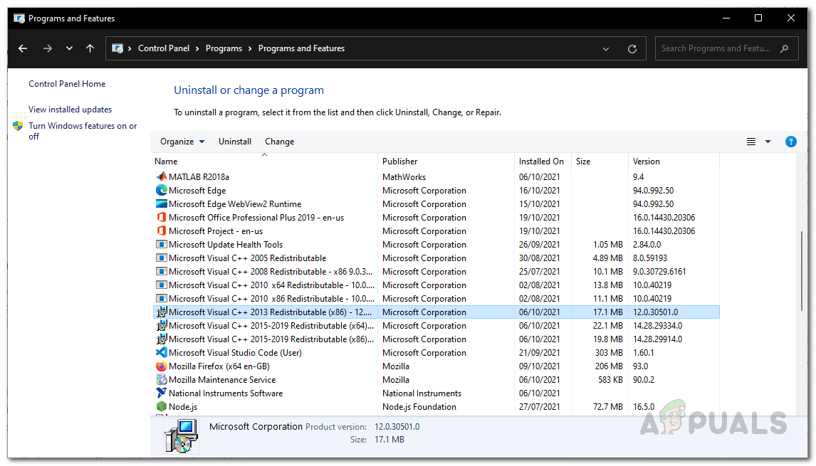 Control Panel - Look through the list of installed programs for any Microsoft Visual C++ Redistributables. Double-click on each one to uninstall it. Make a note of the different versions you see (for example, 2013, 2015, etc.).