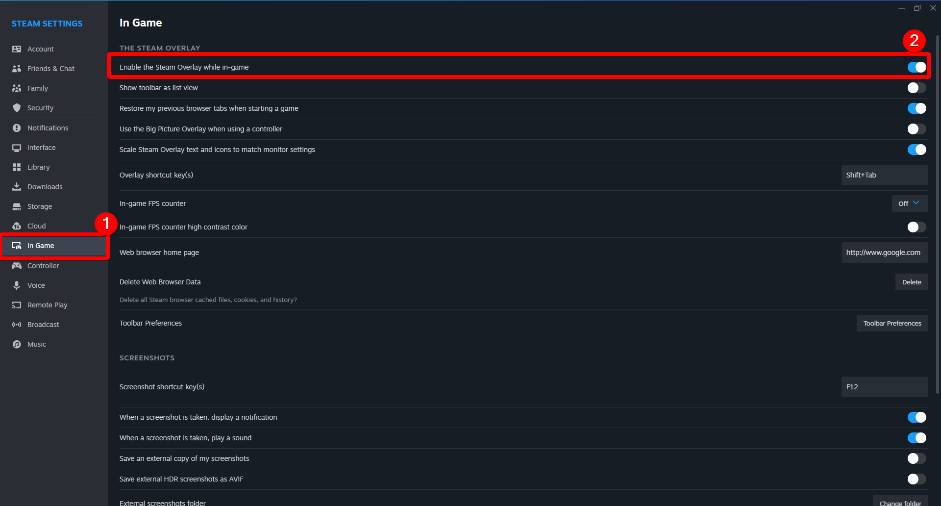 - Steam Overlay: Go to Steam settings > In-Game settings and toggle off the Steam overlay.