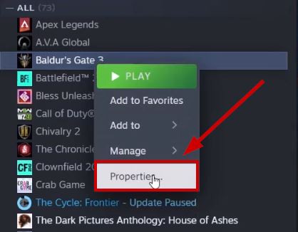 - Right-click on Baldur’s Gate 3 and choose Properties.