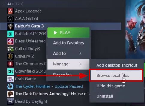 - Go to your Game Library and right-click on Baldur’s Gate 3.