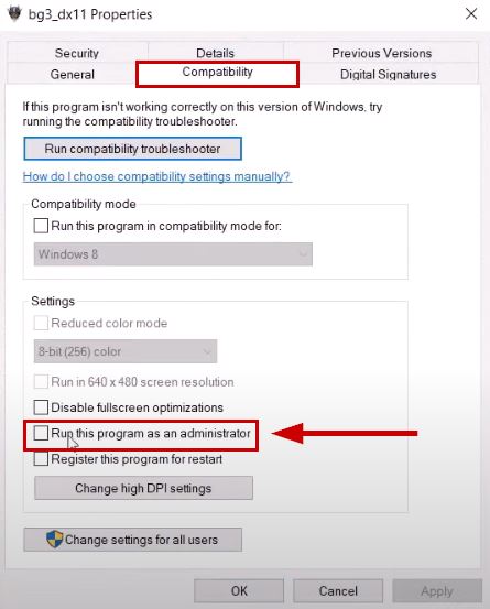 Running the game as an administrator can sometimes make it not start properly, especially with Larian’s launcher. Turning off “Run as administrator” lets the game run normally, which helps it work better with things like Steam Overlay, cloud saves, and anti-cheat systems. These features might not start correctly if the game runs with extra permissions.