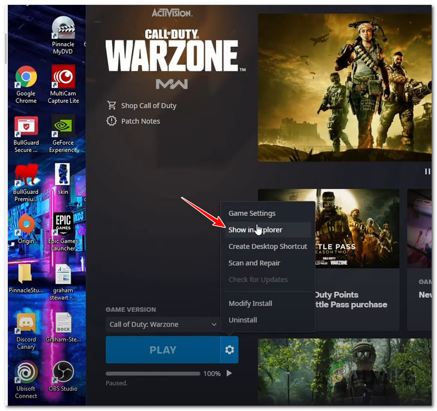 - Open Battle.net and click on Call of Duty: Modern Warfare. Then click the gear icon next to the Play button and select Show in Explorer from the menu.