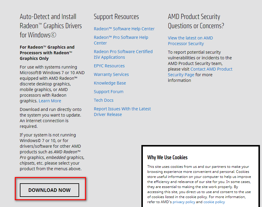 - Scroll to Auto-Detect and Install Radeon Graphics Drivers for Windows and click Download Now.