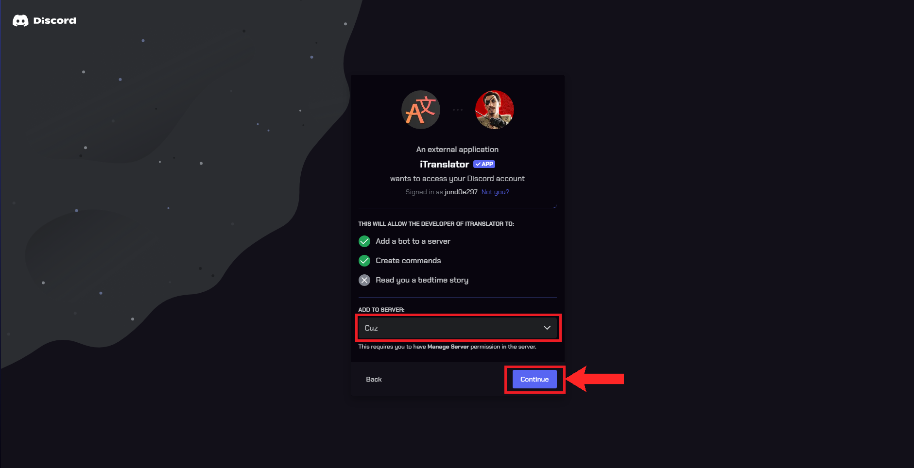 Select your server and click “Continue” - Check the permissions to be granted to the bot, scroll down, and click Authorize.