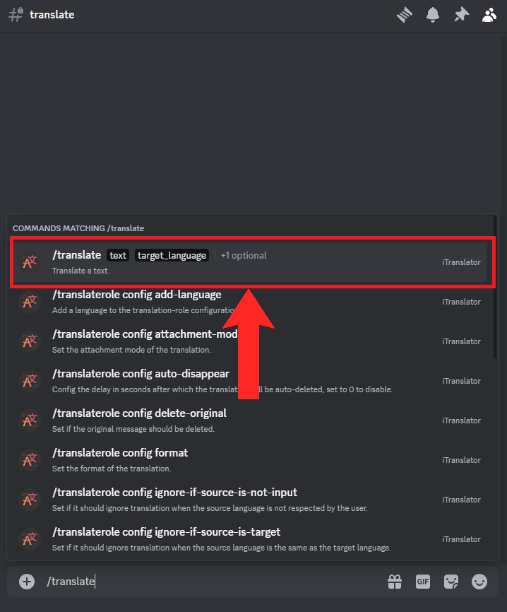 - Open your Discord server and navigate to any text channel. Type “/translate” and select the first option from the suggestions.