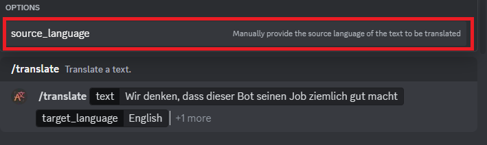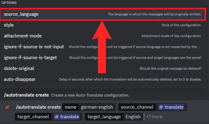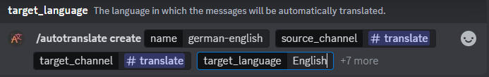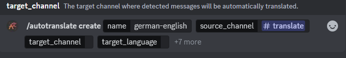 Choose the same or a different text channel for “target_channel” - Choose the output language under the “target_language” option.
