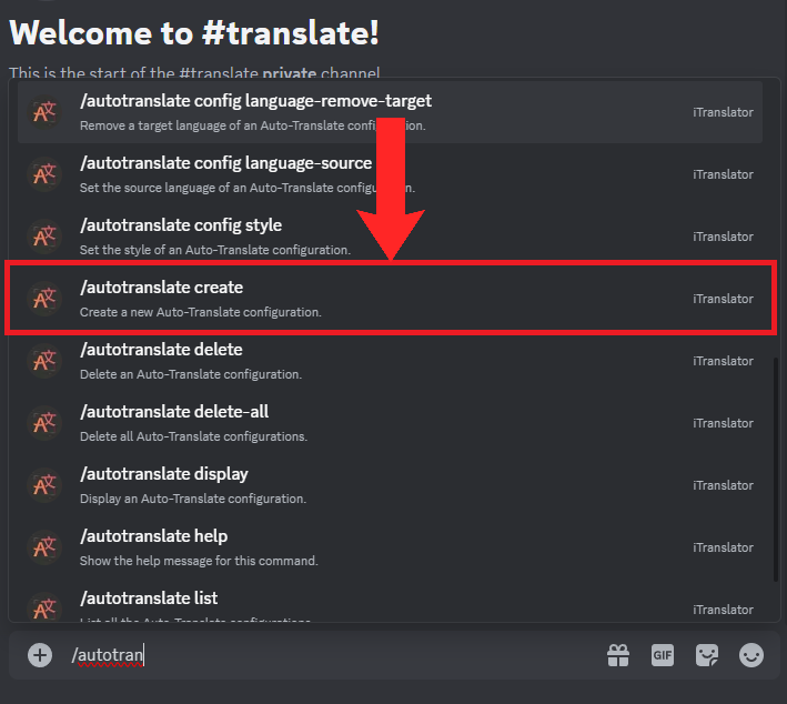 - In any text channel, type “/autotranslate“. From the suggestions list, select “/autotranslate create“.