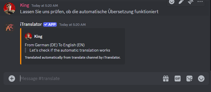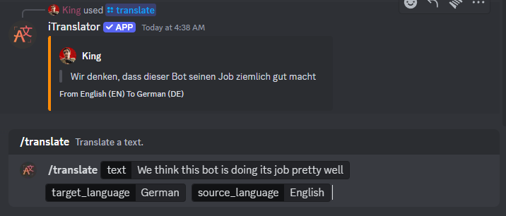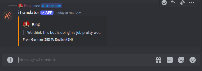 We tested several bots and found iTranslator to be the clear winner. Although a freemium bot (offering both free and premium versions), iTranslator has all the essentials: auto-translation, manual translation, translation in DMs (direct messages), and support for multiple languages. You can check out its full features in the bot’s documentation.