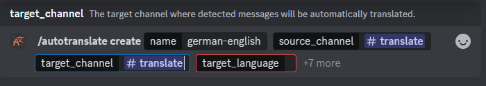 Set the “source_channel” to your desired text channel - Select the “target_channel” where the translated texts will be output. You can choose the same or a different channel.