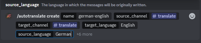 Click on the “/autotranslate create” option - Enter a name in the “name” option, like “german-english“.