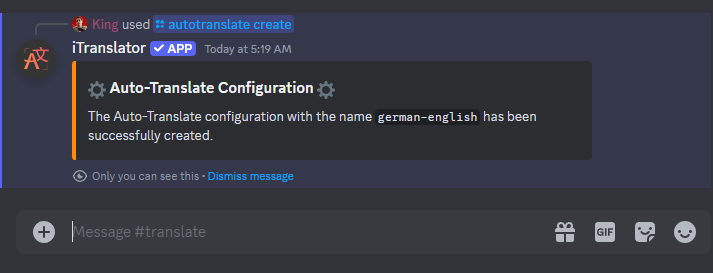 This message confirms the command was accepted - Press Enter or click the Send button to test your new translation setup!