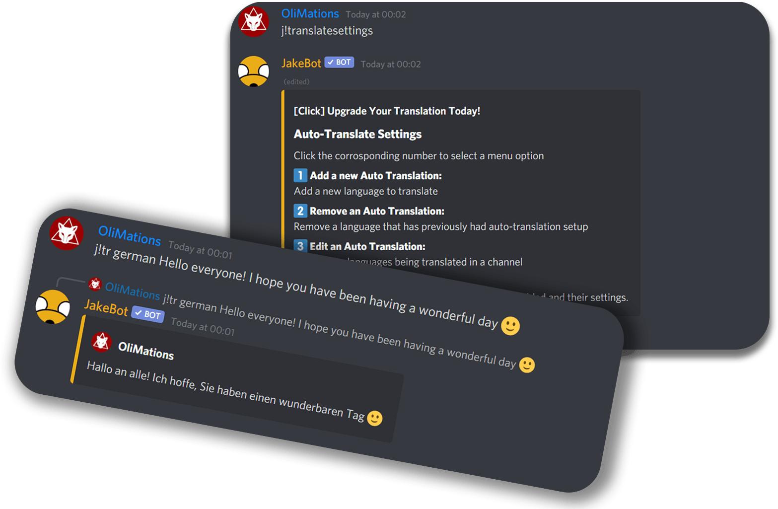 JakeBot is a feature-rich translation bot that offers numerous features besides translation, such as roleplay, trivia, and wordclouds. Its translation capability includes auto-translation with blacklist and whitelist functionalities. However, you can only set up auto-translation for 8 channels, and it may feel overwhelming to use.