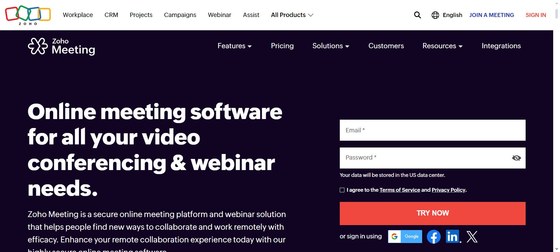 Zoho Meeting is a secure and easy-to-use online platform perfect for video conferencing and webinars. It is designed to enhance collaboration and productivity, whether at home or in the office. You can seamlessly start or join meetings from desktops, phones, or tablets.
