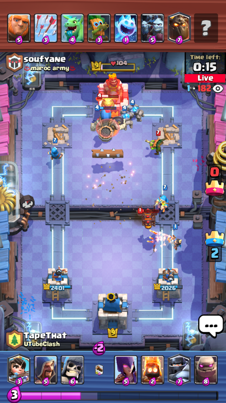 Clash Royale’s gameplay is pretty simple; you have 3 towers that you need to protect on the battlefield. To protect them, you make a deck of 8 cards that feature unique units. The deck is recycled in a random order throughout the game. Each unit has a deployment cost, paid in the form of “Elixir“. Elixir is gathered over time passively throughout the game, so it is continuously refilled.