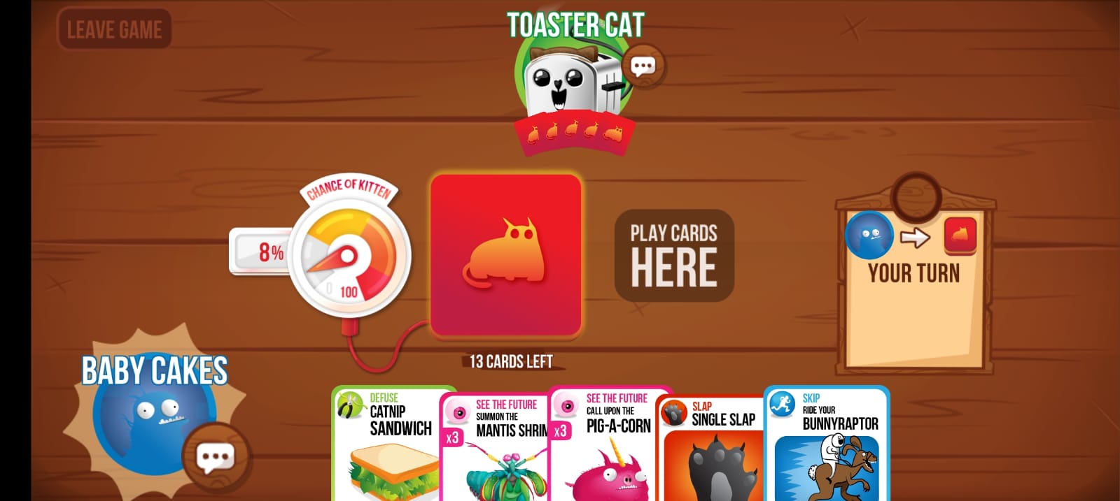 When an Exploding Kitten is drawn, the player must defuse the bomb on the screen quickly. If they are successful, they’re still in the game. If they fail, they’re out of the game. The game ends when the last man standing remains. During this whole bout, players can play the cards in their hands that impact the game greatly. They can reverse the turn order, have a peek at the upcoming cards etc.