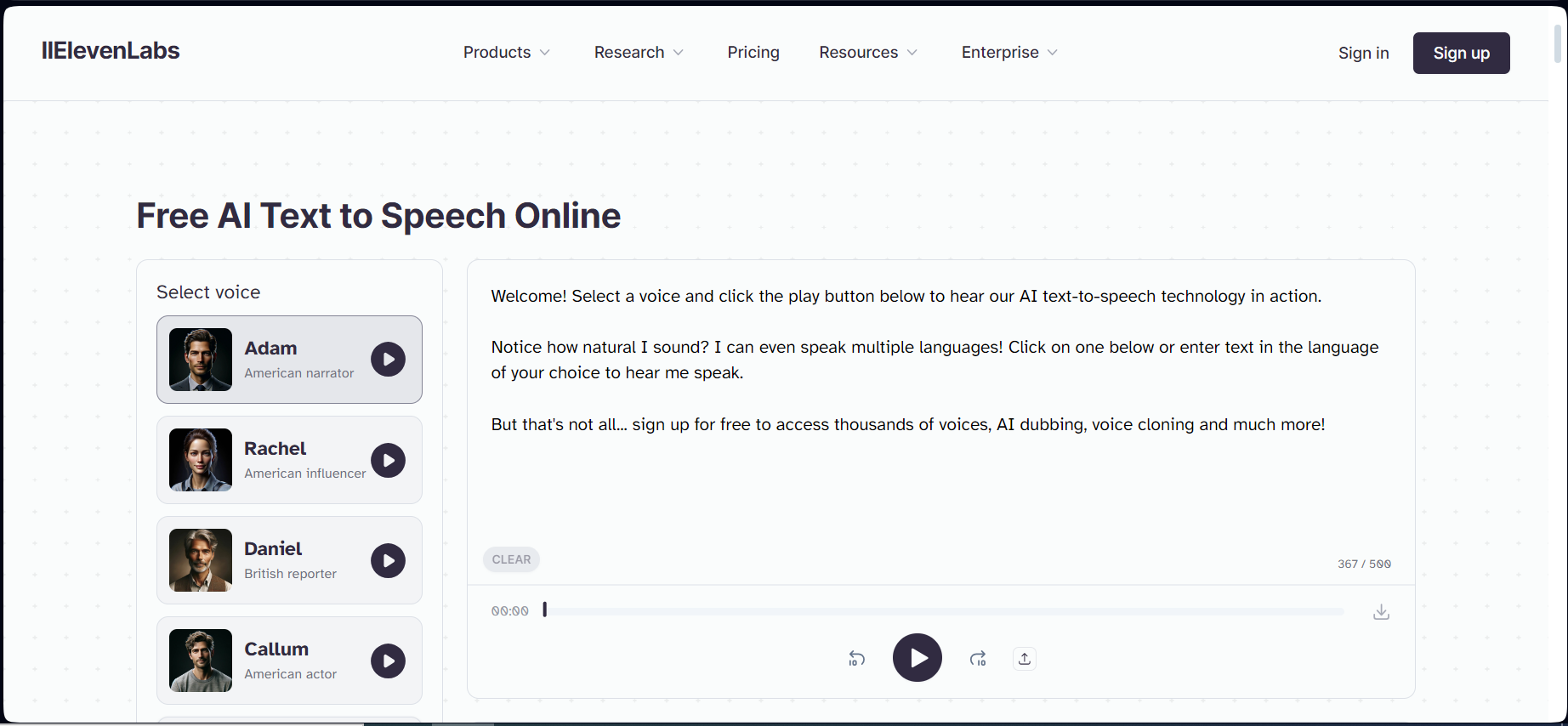 ElevenLabs is an advanced text-to-speech platform powered by sophisticated AI. It’s designed to generate highly realistic voiceovers for a wide range of uses, from digital content to educational resources.