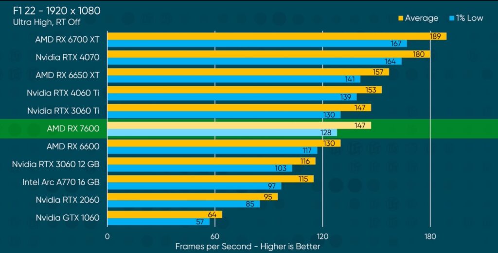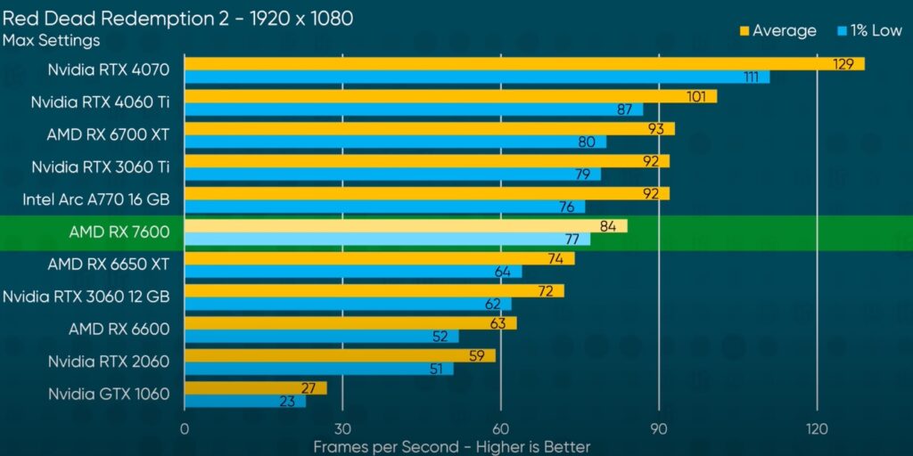 For 1080p gaming, the RX 7600 is an excellent graphics card. It has a low power draw and enough raw power to handle most triple-A titles on a high refresh rate 1080p monitor.