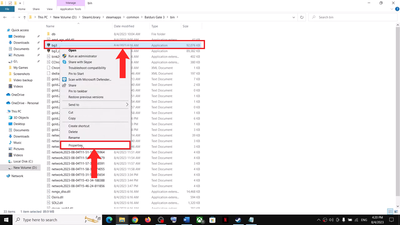 You can open up the installation folder for any game from your Steam Library - Then, go to the bin folder and right-click on the bg3 file. Choose Properties.