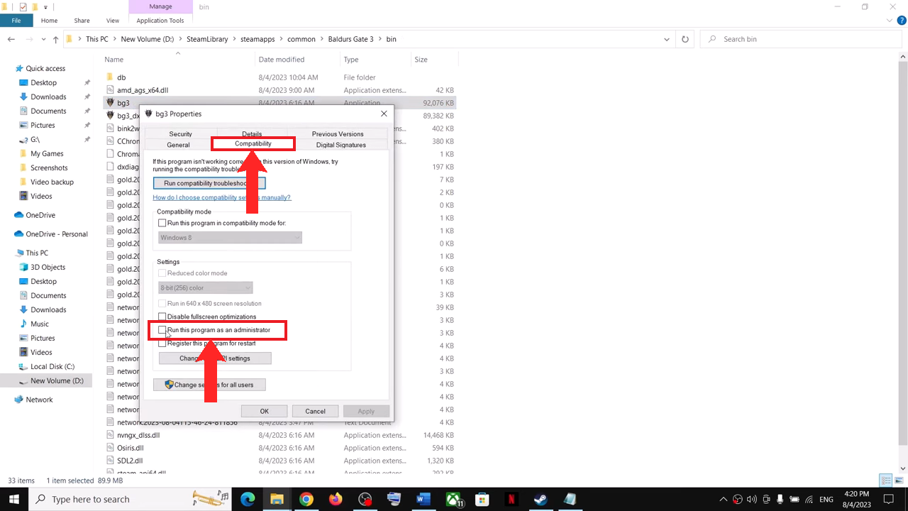 It might seem like running the game as an administrator is the safest bet, but in this case, that can actually be what’s causing your launch issues. When you use a mod manager, it often skips the “Run as admin” prompt, which can block the game from opening properly. You can easily turn off this setting using these steps: