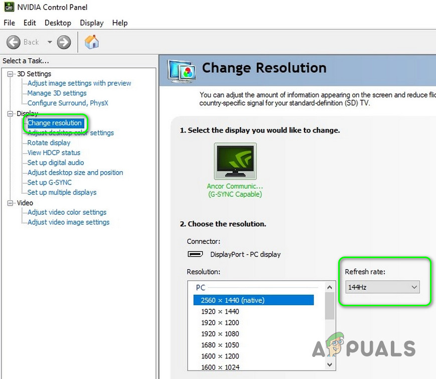 - Select Display Resolution and check the Refresh Rate (make sure to choose the right display if you have more than one).