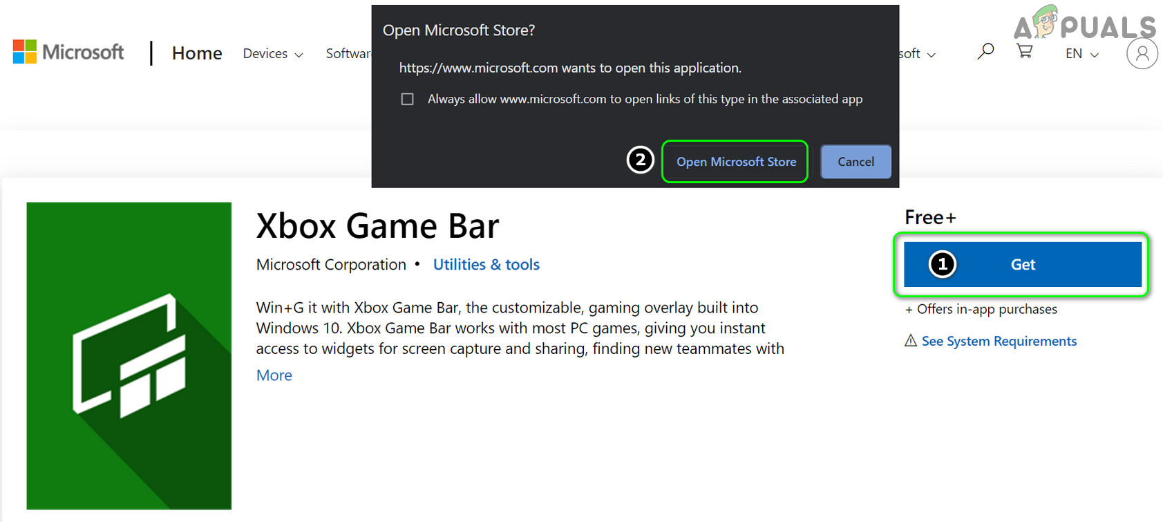- Click Get, and in the pop-up, select Open Microsoft Store.