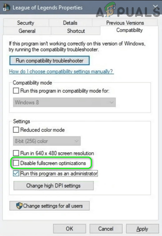 Disable Full-Screen Optimization of League of Legends - Click Apply to save your changes, then reboot your PC.