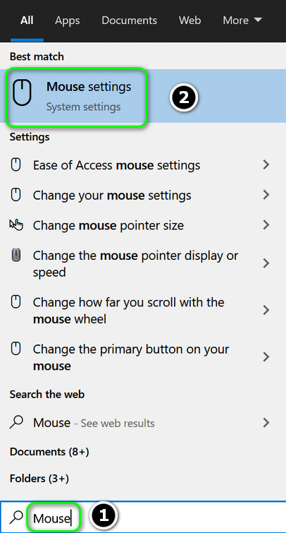 - Press the Windows key and type Mouse, then select Mouse Settings.