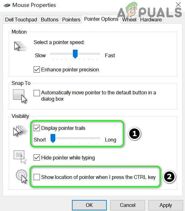 - Adjust the slider (using a short trail is usually best), and uncheck Show location of pointer when I press the CTRL key.