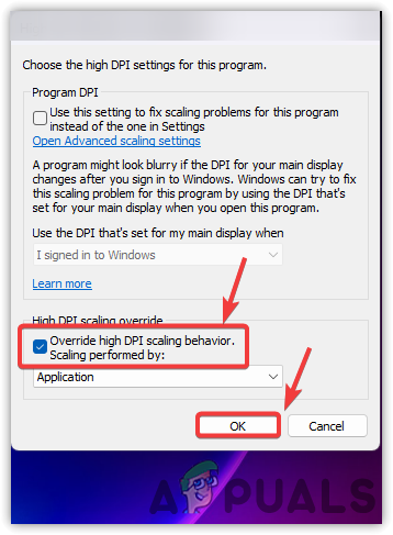 - Check the box for Override high DPI scaling behavior and hit OK to save.
